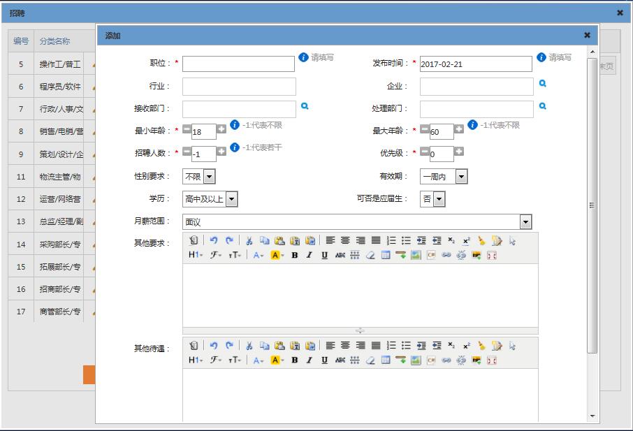 2. 管理員在相關(guān)分類下發(fā)布招聘信息,并提供相關(guān)職位