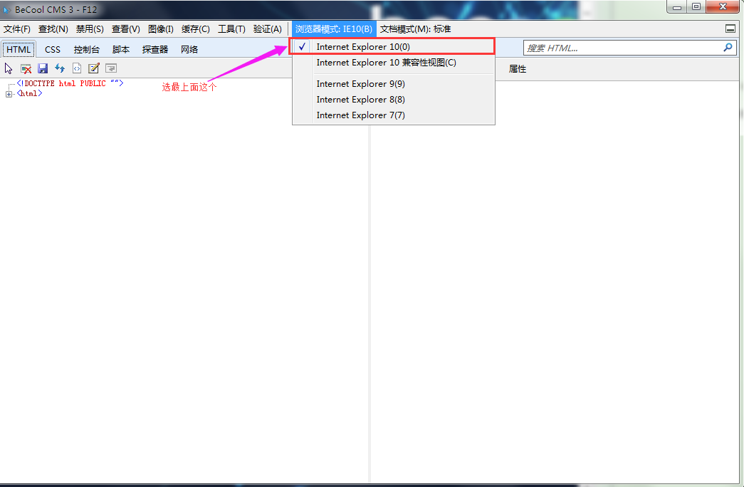 看到瀏覽器模式和文檔模式,根據(jù)IE版本選擇對應(yīng)的模式。如IE10,瀏覽器模式默認(rèn)為IE10,文檔模式會默認(rèn)是標(biāo)準(zhǔn)模式。注意不要選擇有“兼容性視圖”的瀏覽器模式,文檔模式會隨之變?yōu)?/span>IE7或更低版本。