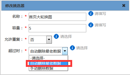 :修改挑選器容量(即幾圖輪換)和是否允許重復的文章圖片播放也是此操作步驟,只是修改“容量”后的數(shù)值,或選擇“允許重復”的是與否。