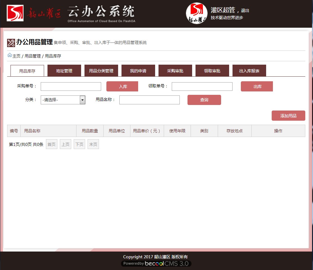 本模塊名為辦公用品管理,用于韶灌辦公區(qū)域的用品管理。特點是操作簡單方便,能滿足對用品的各種操作,這是集申領(lǐng)、采購、審批、出入庫于一體的用品管理系統(tǒng)。 |