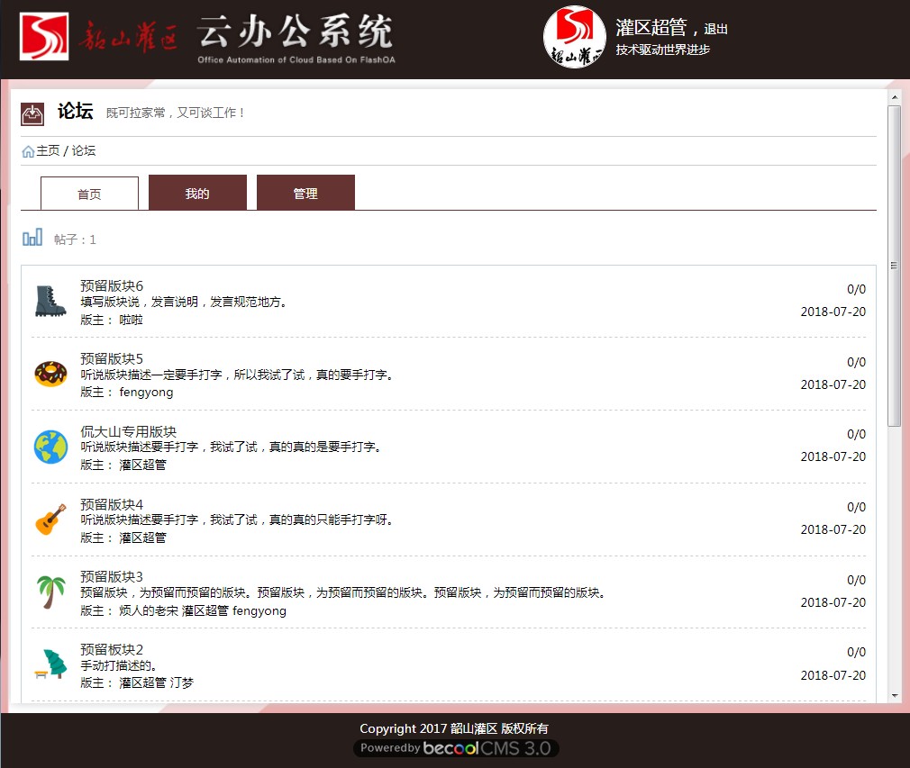 板塊、板塊置頂、禁用帖子、發(fā)帖、帖子、點贊與反對、回帖、我的、刪除帖子、我的管理、添加板塊、查看板塊。 |
